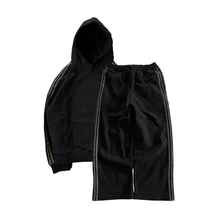 Heavyweight cotton blend hoodie and sweatpants bundle designed for a relaxed, oversized fit. Features four cheetah stripes on each sleeve and a premium embroidered chest graphic on the hoodie, paired with an embroidered logo on the right leg of the sweatpants.