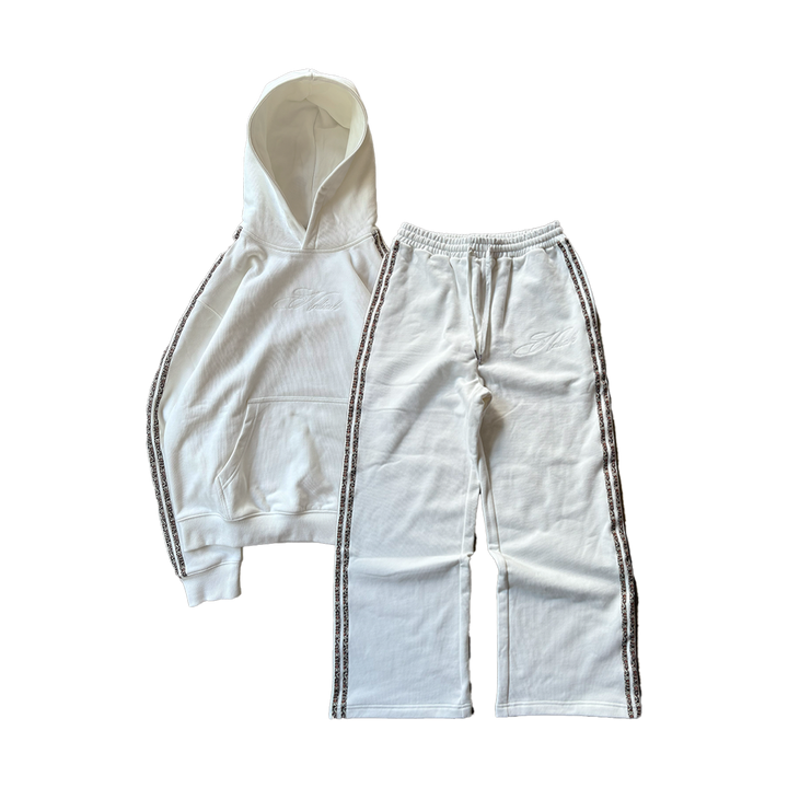 Heavyweight cotton blend hoodie and sweatpants bundle designed for a relaxed, oversized fit. Features four cheetah stripes on each sleeve and a premium embroidered chest graphic on the hoodie, paired with an embroidered logo on the right leg of the sweatpants.
